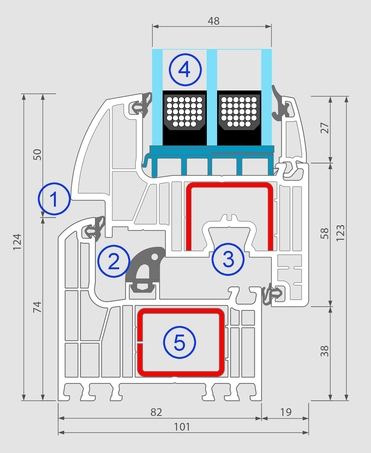 7-komorowa budowa profili GL SYSTEM klasy A o głębokości zabudowy 82 mm i 96 mm skrzydła o zaokrąglonym na zewnątrz kształcie. |